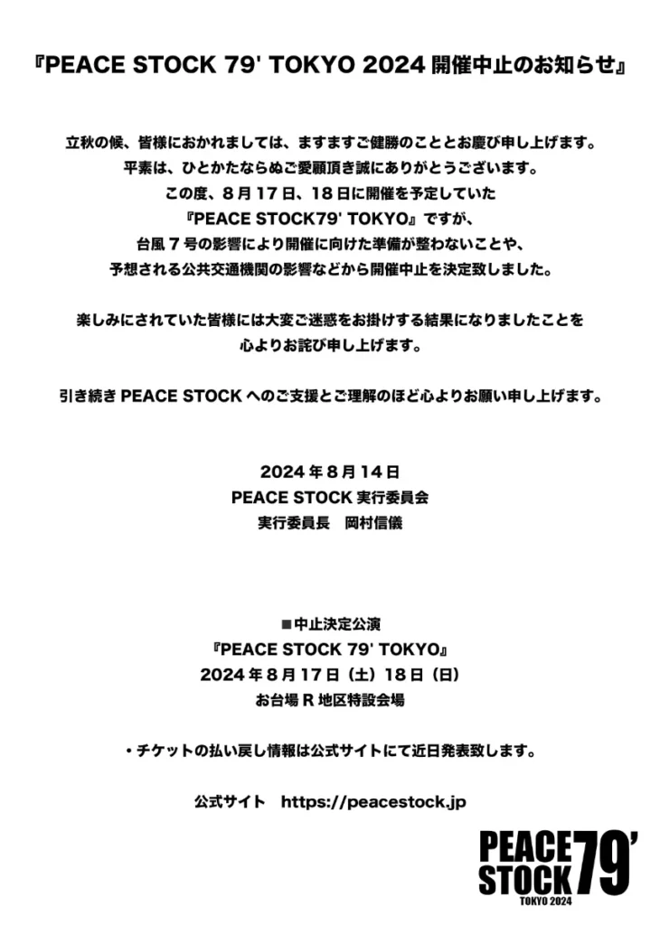 TOKYO 2024.8.14 PEACESTOCK 79′ TOKYO 台風の影響により開催中止のお知らせ 本イベントの発起人である、島谷ひとみとHIPPYからの説明動画はこちらよりご覧ください。 一覧に戻る